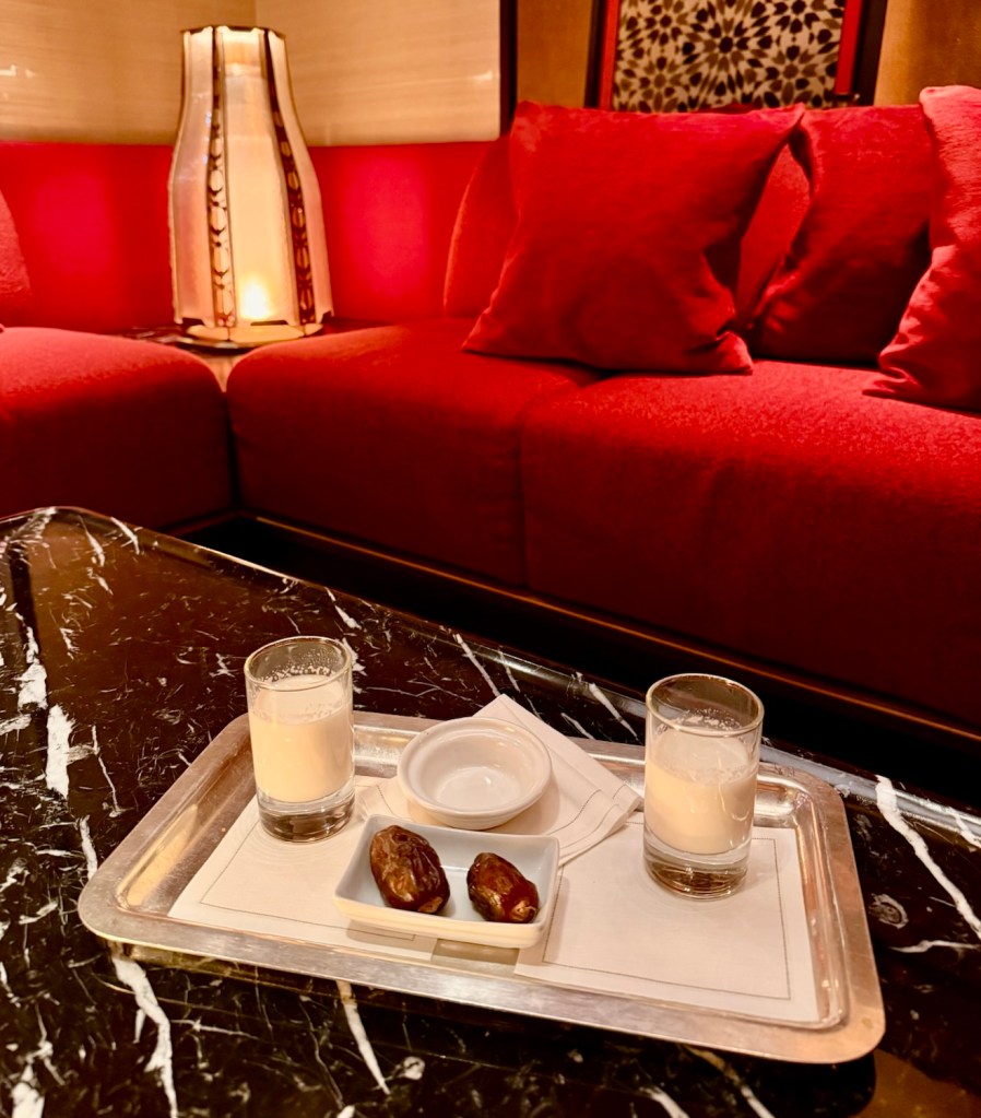We were guided past the reception desk and invited to take a seat on the sumptuous red velvet sofas just beyond. As credit card details were discreetly taken, a tray arrived with almond-flavoured milk and dates—an elegant welcome that quietly sets the tone for the stay ahead.