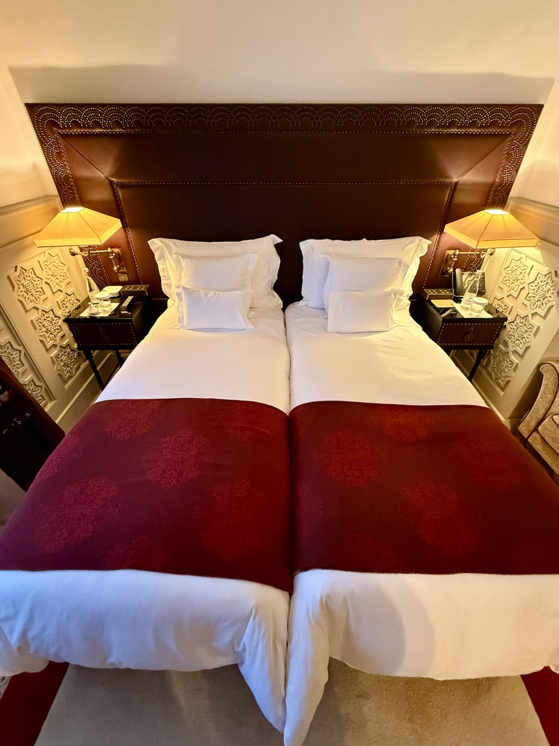 Rooms come with high-end touches like Porthault bed linens, plush bathrobes, and slippers. You’ll find a Nespresso machine, plenty of bottled water, plus dates and chocolate cake—kept topped up regularly.