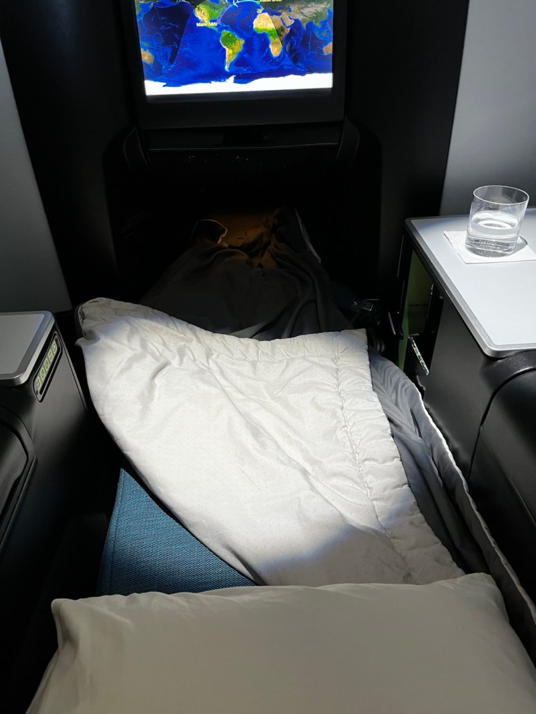 The seat is entirely acceptable for a few hours of rest, converting into a flat space. However, it does feature the all-too-common small foot box—a design flaw that, thankfully, doesn’t completely hinder your ability to get some rest. While there is no luxurious branded bedding or plush mattress topper, for these relatively short overnight hops, the seat is functional and comfortable enough that a decent sleep is at least achievable.