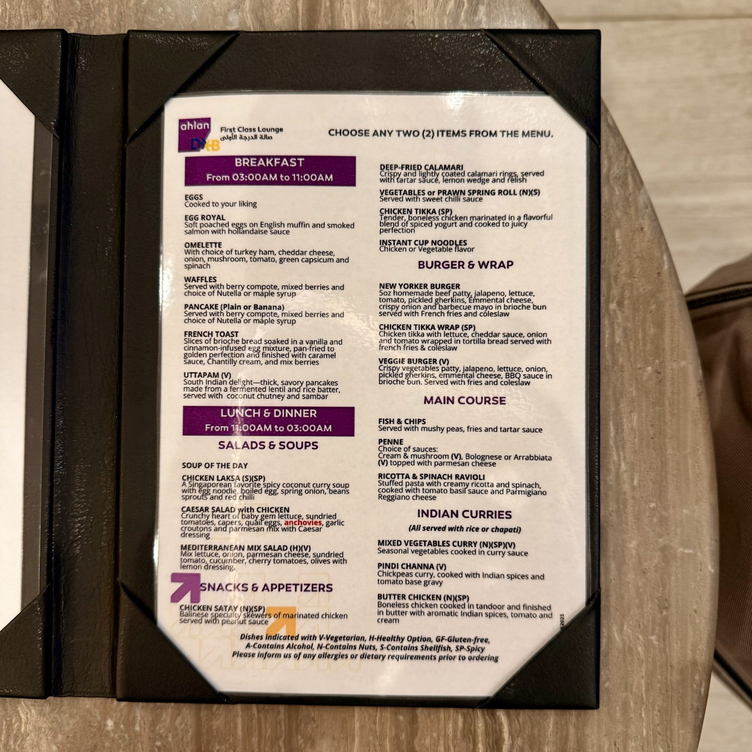 Access to the Ahlan Lounge’s First Class section in Dubai was a welcome perk of Oneworld Emerald status. This offered a separate and quieter part of the lounge with seated table service and upgraded menu away from the main lounge’s busy buffet. The space, though comfortable, felt a little tired and dated, and the relaxed environment was often spoilt by other passengers using loud video calling.